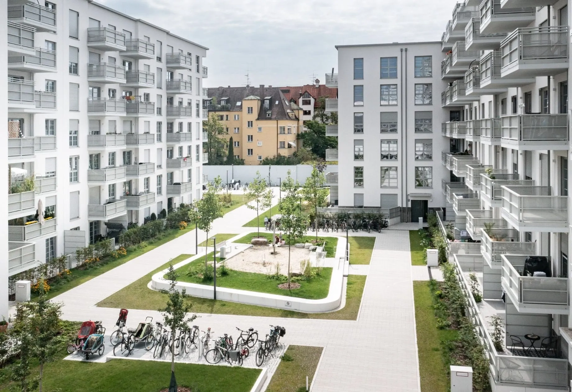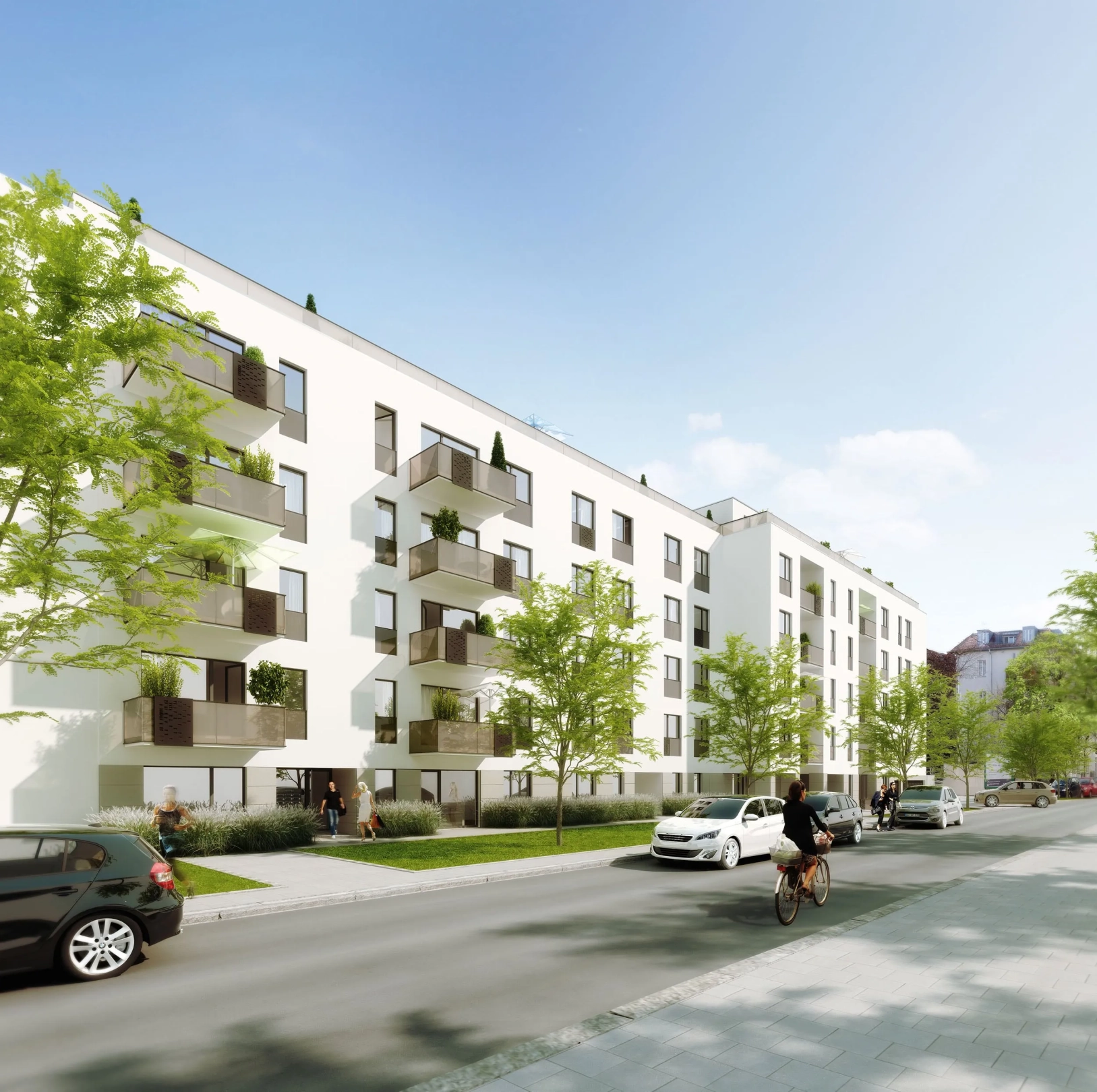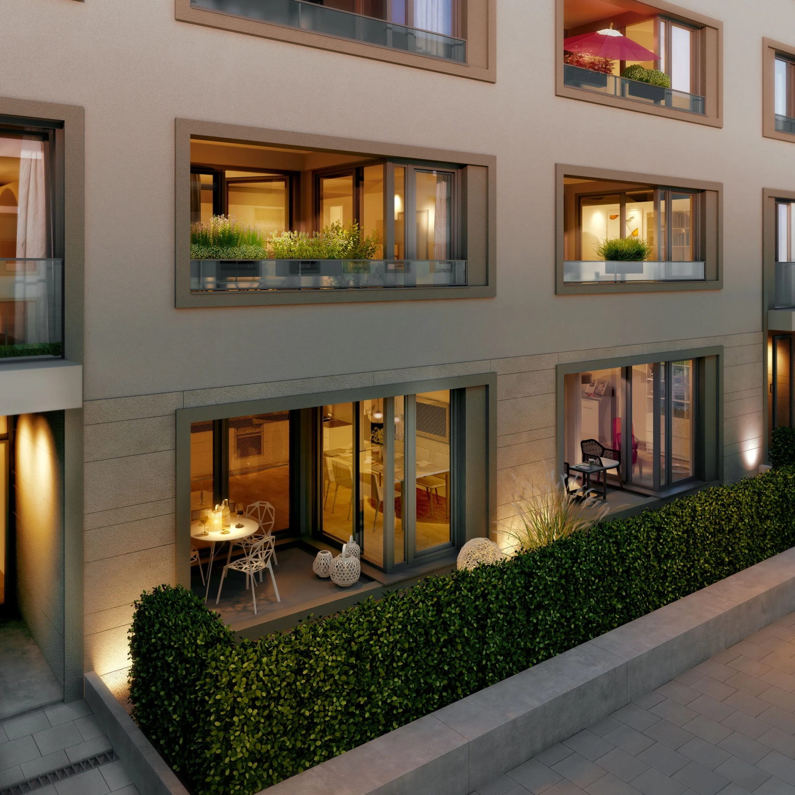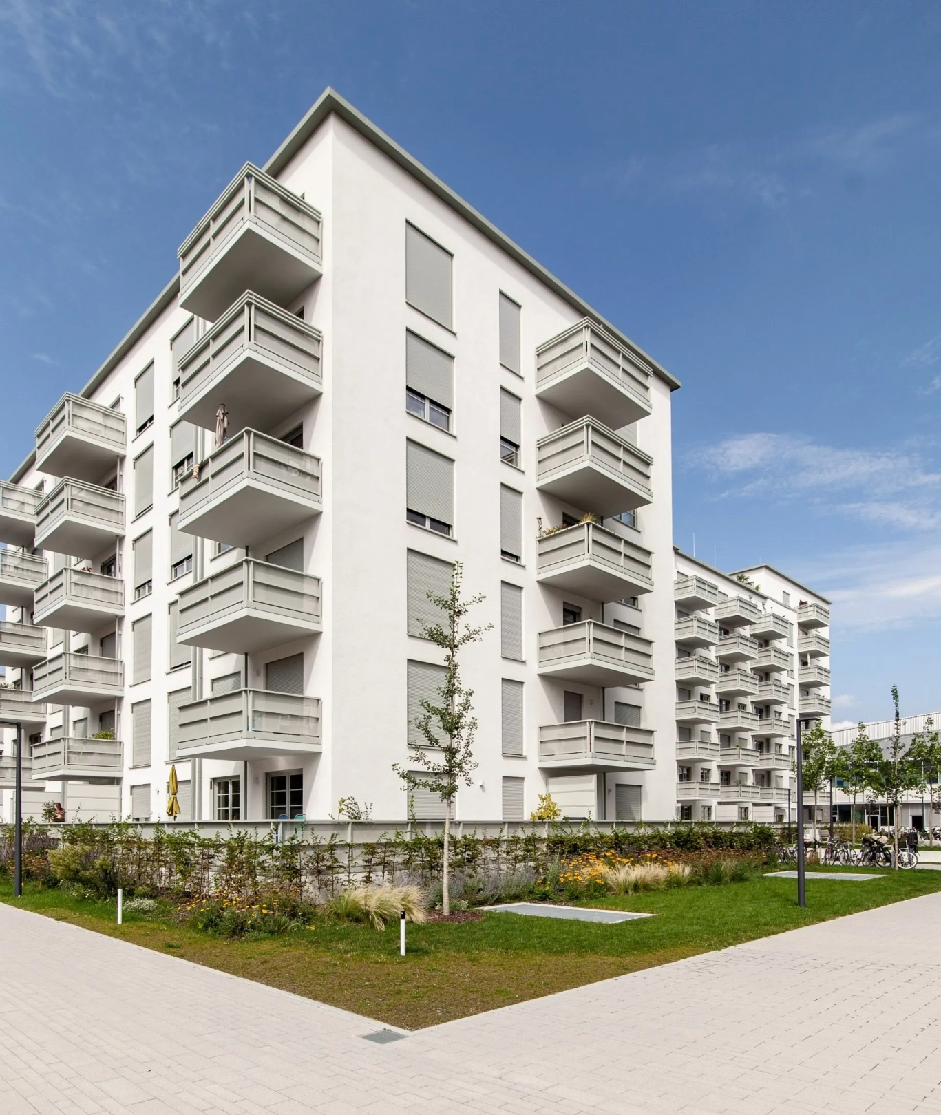 Entspanntes Wohnen im Herzen von München: Die Architektursprache dieses Neubaus verbindet klassische und zeitgenössische Elemente zu einem urbanen, eleganten Fassadenkonzept. Die grünen Freiflächen, rund um die Gebäude, sind besonders großzügig angelegt und verwöhnen die Anwohner mit einem geradezu idyllischen Wohnumfeld.