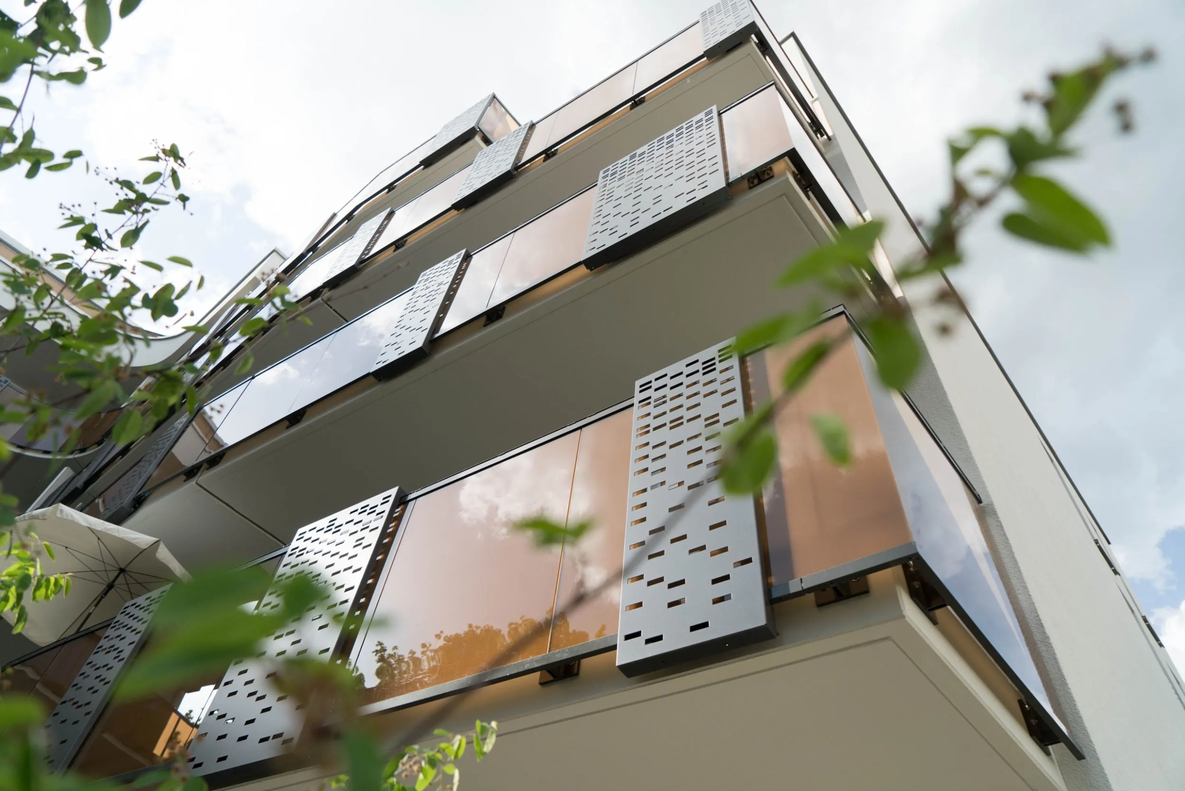 Die attraktiven Natursteinfassaden im Erdgeschoss, der champagnerfarbene Anstrich und die großzügigen Terrassen und Balkone der Gebäude muten sehr elegant an und unterstreichen das hochwertige Ambiente dieses Ensembles.
