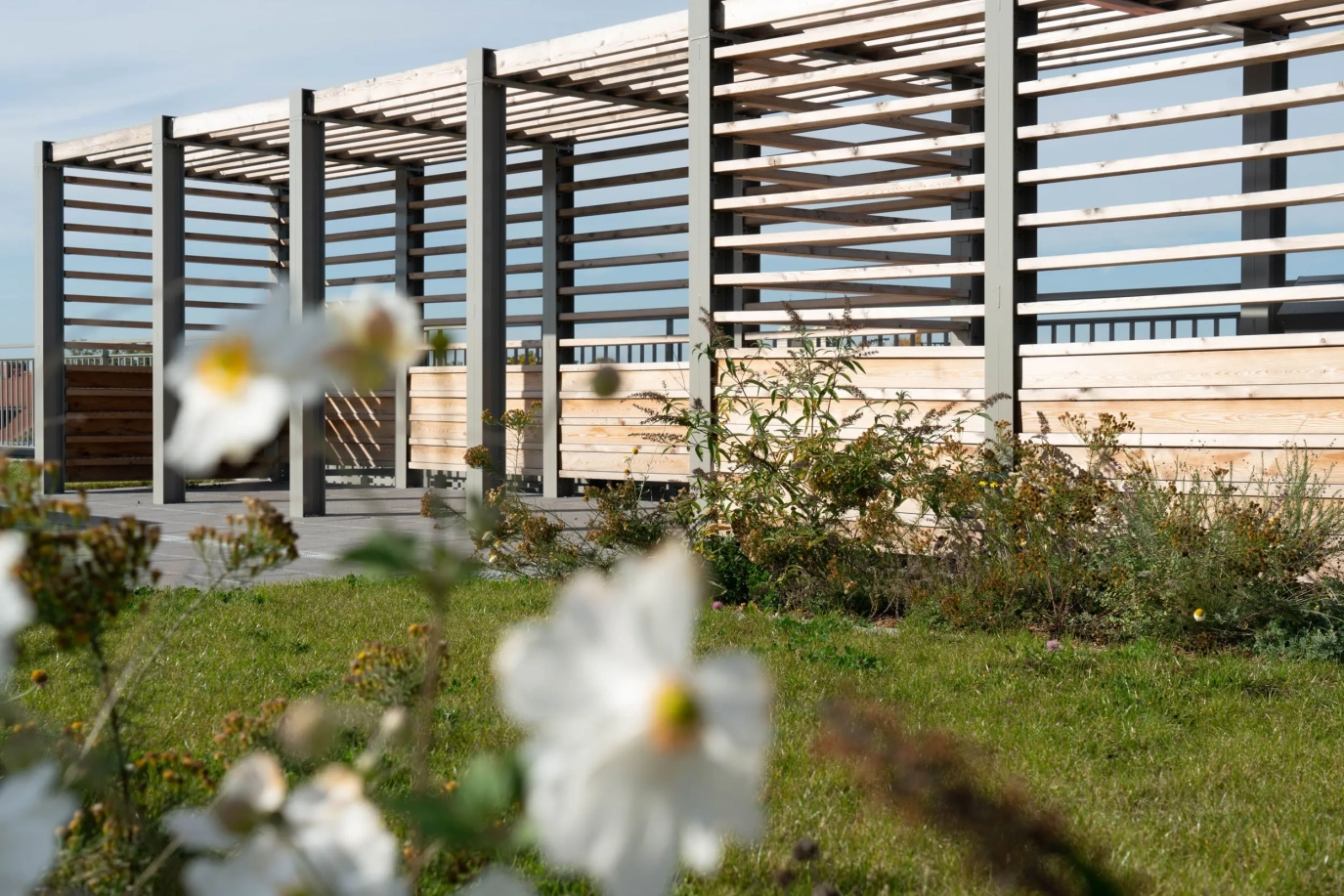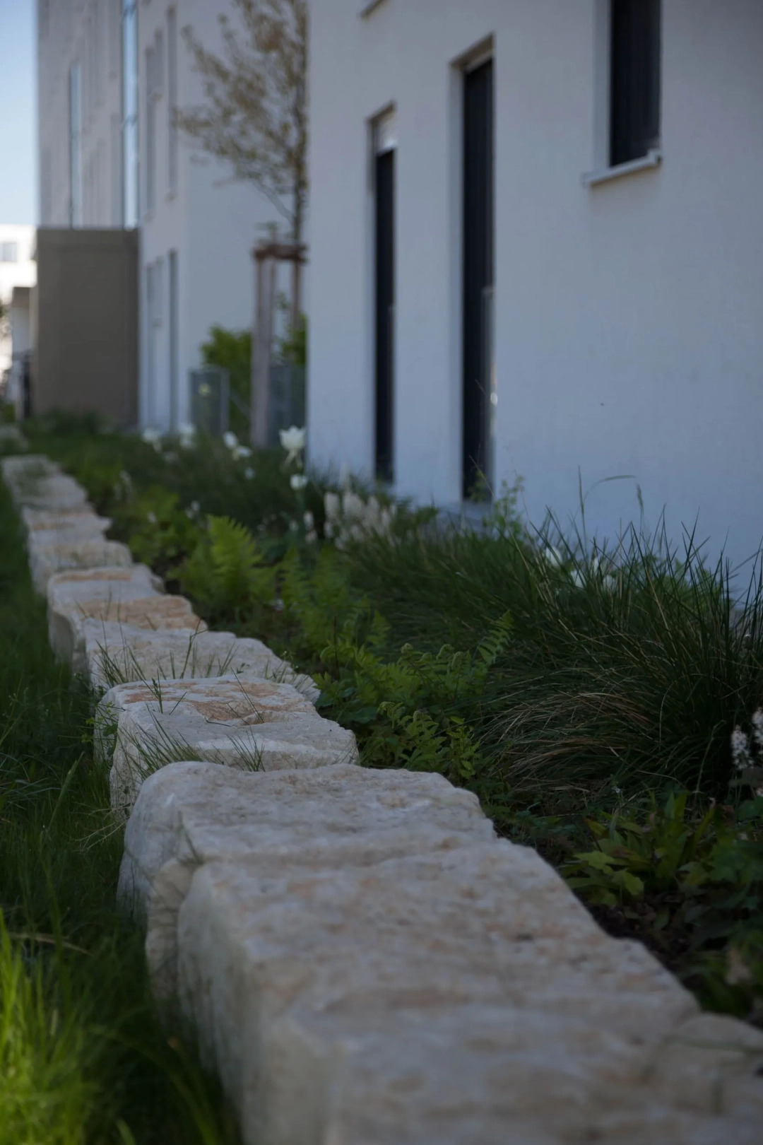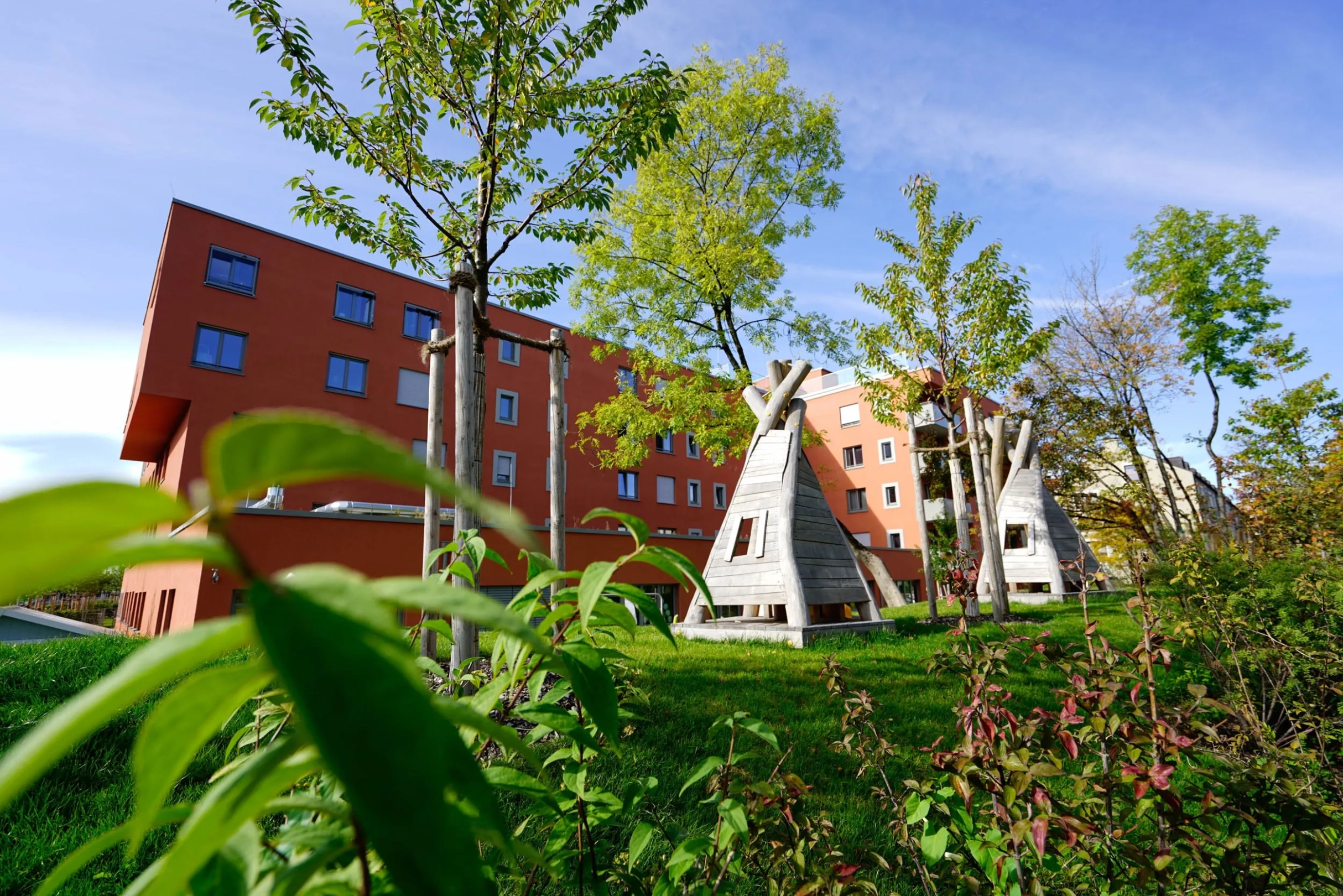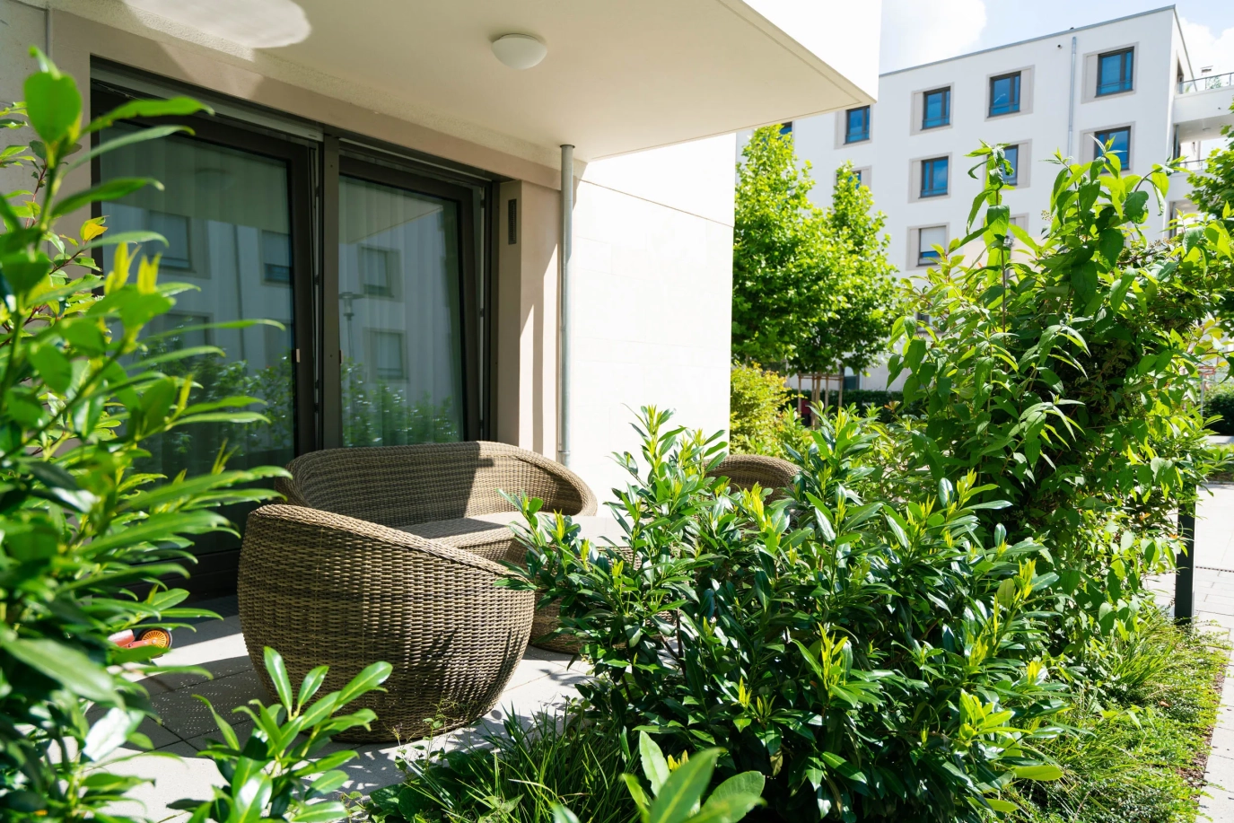 Eingebettet in eine liebevoll gestaltete Parklandschaft kommt hier auch der grüne Aspekt nicht zu kurz. So entstand eine gelungene Kombination aus Natur und Moderne.