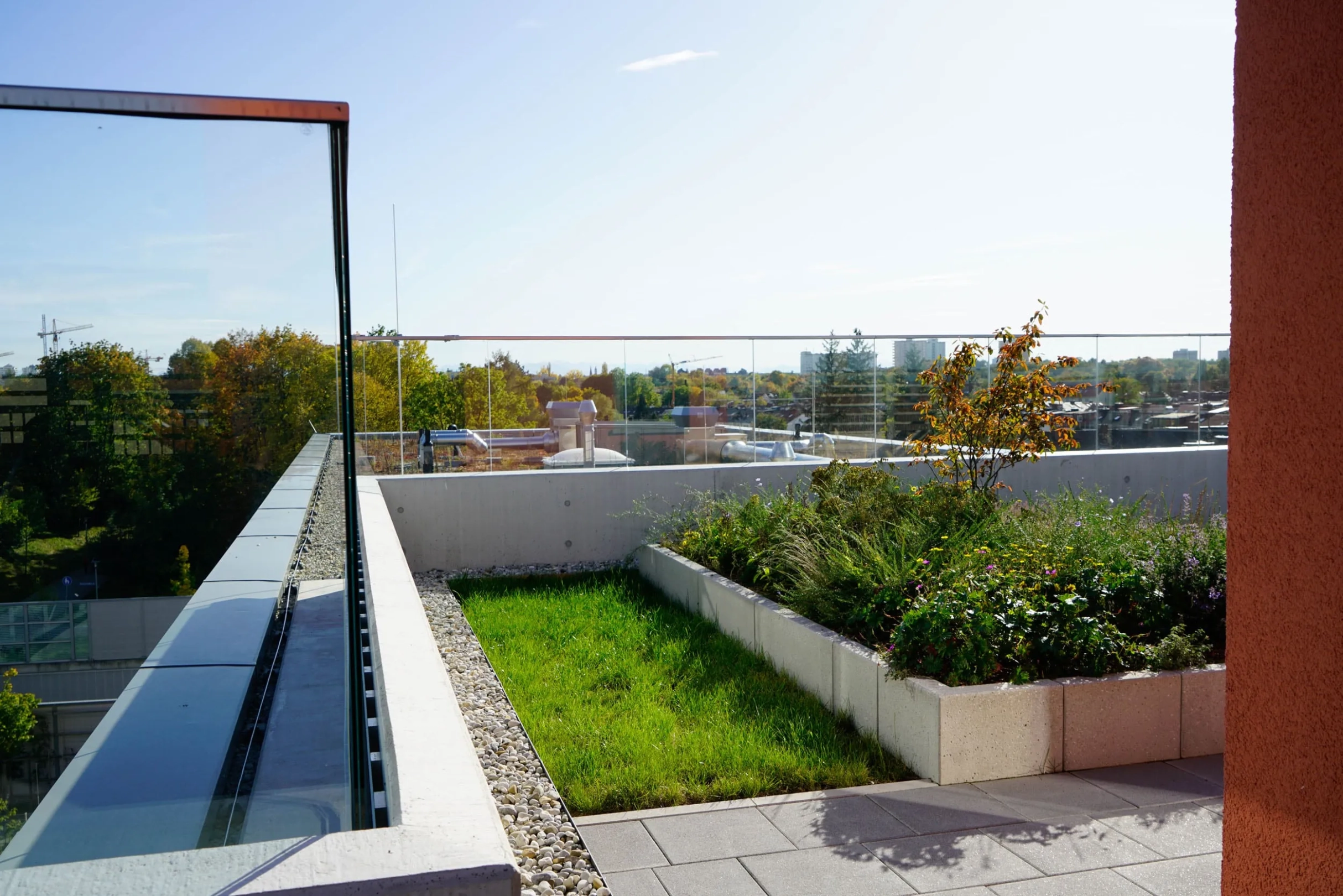 Luisen Grün liegt mitten im schönen Sendling-Westpark und fügt sich mit seinen charmanten Grünanlagen ideal in die idyllische Wohnkultur des Stadtviertels ein. Die denkmalgeschützte Nachbarin, die Kirche St. Thomas Morus, inspirierte die Architekten zur rötlichen Farbgebung der Fassaden. Außerdem lässt die elegante Verglasung, zwischen den südlich ausgerichteten Gebäuden, eine harmonische Außenansicht und ruhige Innenhöfe entstehen. Ein besonderes Highlight genießen die Bewohner zudem hoch oben, auf den Dachgärten der Gebäude. Die begrünten Oasen stehen allen Bewohnern zur Verfügung und spiegeln den Zeitgeist des neuen Ensembles wider.