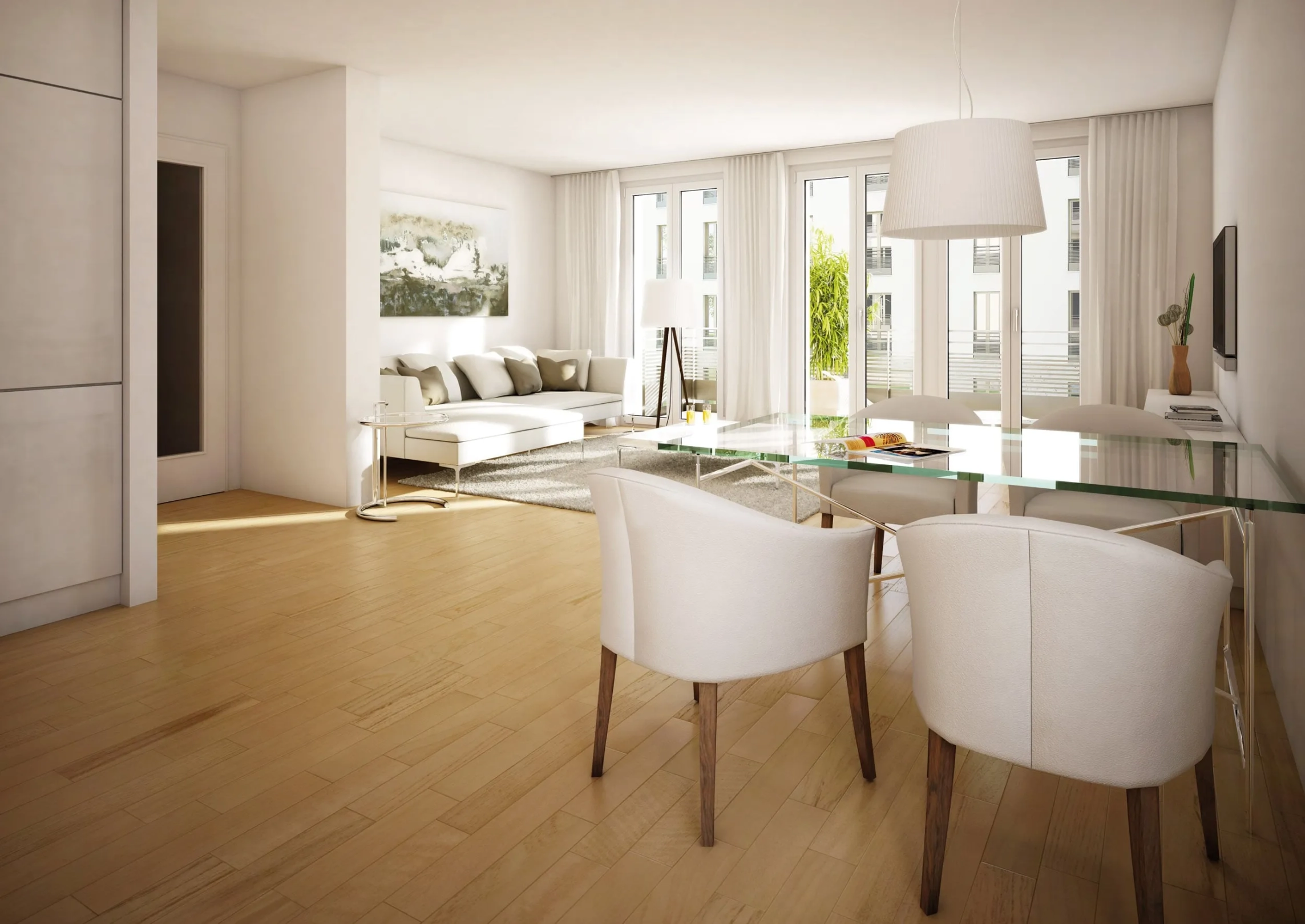 Die Wohnungen selbst bestechen durch intelligent geplante Wohnräume und ansprechende Ausstattungsmerkmale wie edlem Echtholzparkett, Fußbodenheizung und Feinsteinfliesen. Für alle, die den Glamour Münchens lieben und sich zugleich ein grünes Zuhause wünschen.