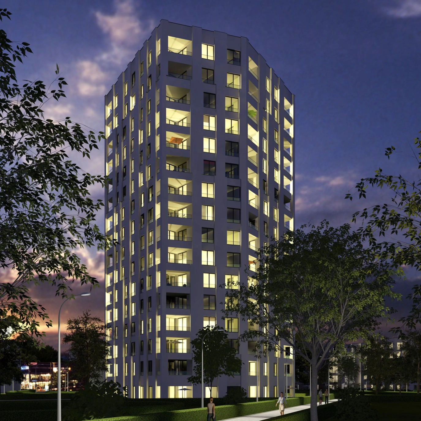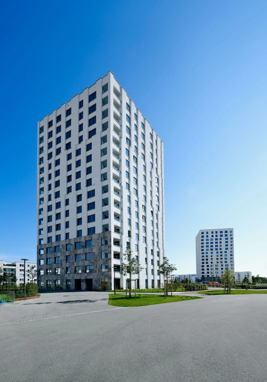 73 Eigentumswohnungen in einem architektonischen Meisterwerk vereint. Der imposante Wohnturm mit 16 Stockwerken bietet seinen Bewohnern neben einer modernen Marken-Ausstattung auch einen fantastischen Panoramablick über die Stadt München. Die reizvolle Fassade stammt von dem Architekturbüro Diener & Diener aus Basel, die 2011 mit dem „Preis für Architektur in Deutschland“ ausgezeichnet wurden.