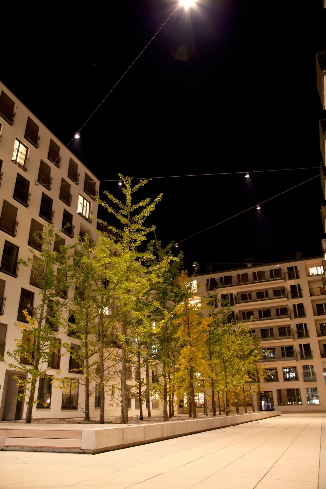 Das Herz der Nymphenburger Innenhöfe bildet die großzügige Medici Plaza. Mit einem eleganten Wasserbecken, den imposanten Gingkobäumen und einem designten Beleuchtungskonzept lädt diese Kulisse einfach zum Verweilen ein.